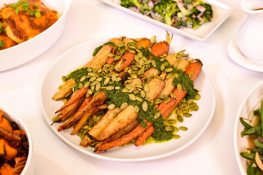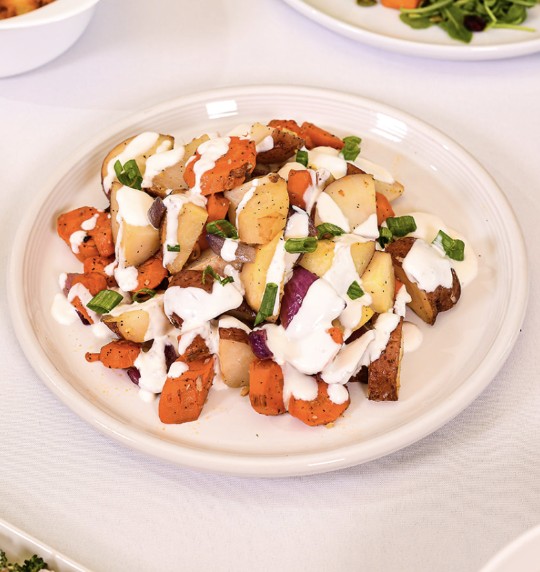 <p>Holiday roots with a sweet kick. Carrots, turnips, parsnips, potatoes, and red onion roast until golden and tender, then get topped with a creamy swirl of hot honey, sour cream, and a splash of vinegar. Fresh parsley finishes it off for a side that’s cozy, colorful, and just the right amount of spicy-sweet.</p>